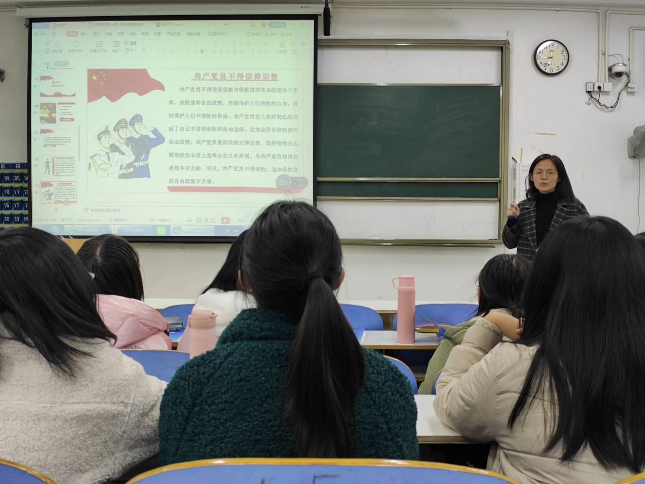 活动中,牛洁楠集中带领全体学生集中学习习近平总书记有关宗教工作的重要论述、《宗教政策法规学习资料》和《大学生中国特色社会主义民族宗教理论知识手册》,向同学们详细讲解了宗教的概念、内涵、作用以及宗教信仰与邪教的区别,使同学们加深对宗教的了解,明晰宗教活动行为的警戒线。