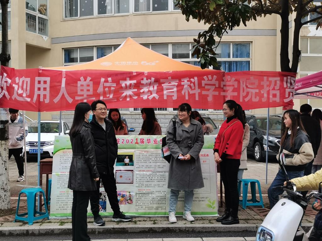 教育科学学院团委学生会就业部成员在活动场地外搭设帐篷,积极做好后勤服务工作,为毕业生提供周到便捷的服务。此次专场招聘会围绕信阳重点领域、新兴产业、重大战略人才需求,共110余家用人单位招聘,涉及教育、信息技术、装备制造、经济管理等多个领域。其中,事业单位学校带编招聘人数466人,民办学校招聘人数636人,企业招聘200多人,共提供岗位1300余个。现场设有事业单位、民办学校及企业三大招聘专区,毕业生可直接根据招聘专区进行筛选单位及精准应聘。招聘会现场气氛热烈,毕业生通过就业处提前发布的信息,积极投递简历,精准咨询,有针对性地准备充分,在应聘过程中发挥良好。部分达成合作意向的学生与用人单位在现场签订了初步协议。招聘单位普遍认为我院学生的学习能力强,综合素质高,愿与我院长期合作。